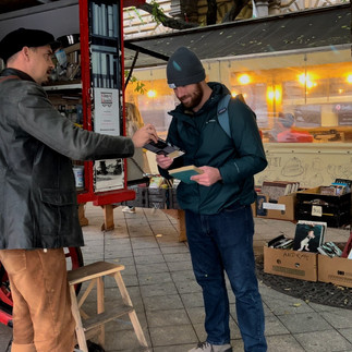 As I went to pay, I struck up a conversation with the gentleman in charge. His name was Joe Whitman. I asked Joe about his stock of books as he bounced around the wagon flipping through the titles he’d chosen himself. “Ah, The Odyssey! Unfortunately, no, but a great story”, he’d say with a wide grin. “I don’t have Old Man and the Sea either. Sorry. A Farewell to Arms, perhaps?” Here was a man whose work interweaves with his passion, his view on life, and his aesthetic completely. He dawned a well-groomed goatee and mustache, a brown leather turtleneck vest, a tweed flat cap, stormtrooper boots, a bracelet on each wrist, two crisscrossing sling bags, corduroy trousers rolled at the cuffs, and a black leather jacket that he “found on the street”. When I pointed out the zippo holster worn fashionably on his front, he explained how he’d purchased two broken lighters and combined their parts into a functioning one. I inquired about what he was reading at the moment, and as it turns out, we are both in the middle of the same book. He recommended a few of his favorite works and spoke about them with the same affection that parents employ when discussing their children. “I’d venture a bet you’re a bit of a poet, Joe Whitman”, I said.
